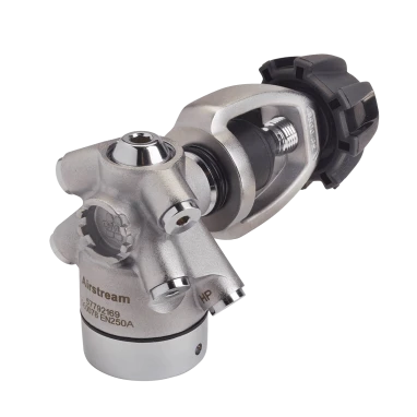 As a diver moves underwater they quickly learn that streamlined gear is critical to diving efficiently and conserving gas. One of the main features of the high-performance Airstream Evoque is the streamlined hose routing of the first stage. The low-pressure ports are angled 30-degrees down and 23-degrees forward to allow hose routing directly over the shoulders keeping the configuration close to the diver’s body. Additionally, the high-pressure ports are angle down 45-degrees for minimal resistance and keeping the SPG as close to the divers’ side as possible. The high-performance Airstream Evoque delivers the industry’s finest work of breathing (WOB) of .8 joules per liter.