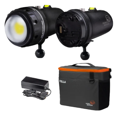 The professional’s choice, Sola Video Pro 15000 combines Light & Motion’s 30 year pedigree as the leader in underwater imaging design with the future of lighting technology. Powerful 15000 lumen certified output and regulated design provides lighting consistency content creators demand. Featuring an exclusive dome port, this optic provides an impressive 115ยฐ flood beam designed for wide-angle work and ensuring full lighting coverage even with a fisheye lens. The Double Dive 1x Kit includes the Sola Video Pro 15000 and and an innovative body module with an included soft case. This allows the shooter to quickly change out the battery body of the light to integrate a fully charged system – yet unlike replaceable batteries this system is reliable (eliminates flooding risks from opening the battery compartment), has enhanced safety with a sealed system, and can be swapped on the Sola lighthead in seconds. The perfect solution for divers that are shooting multiple dives in remote locations and may not be able to recharge the light during a surface interval.