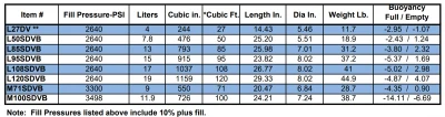 - ( 25.98″ ) Length of cylinder only, no valve. ( 31.2lbs ) Weight is tank only. 7.01″ Diameter. Empty Buoyancy 2.32 lbs, Full Buoyancy -3.8lbs